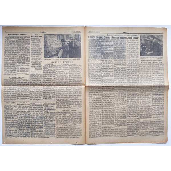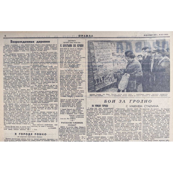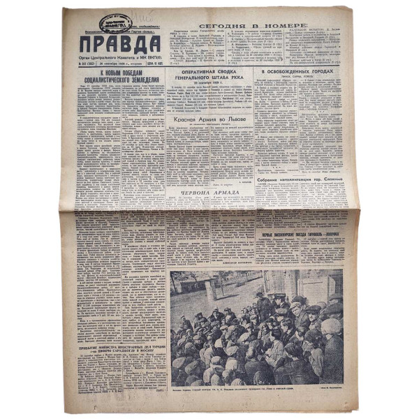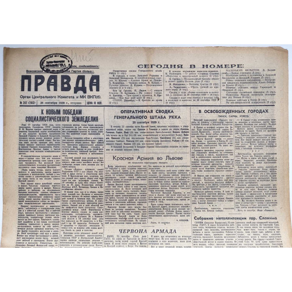 This issue of Pravda, dated September 26, 1939, is a historic document covering the entry of the Red Army into Western Ukraine and Western Belarus. The main focus is the liberation of Lvov, as well as other major cities such as Pinsk, Sarny, and Kovel, following the Soviet-Polish border redefinition in accordance with the Molotov–Ribbentrop Pact. The articles describe in detail the enthusiastic welcome of Soviet troops by local populations, the dismantling of Polish military structures, and the rapid formation of new administrative and social frameworks. The newspaper reflects the ideological framing of these events as a reunification of Slavic peoples under the Soviet Union and a triumph of socialism. This is one of the most significant wartime issues of Pravda, marking the geopolitical transformation of Eastern Europe in September 1939.