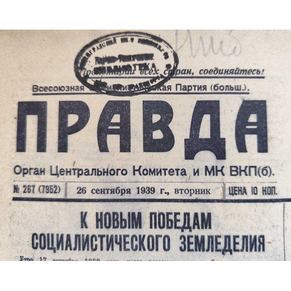 No. 267 (7952) — Tuesday, September 26, 1939 — Price: 10 kopecks