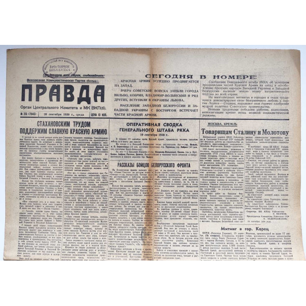 The Red Army is successfully advancing to the west. Yesterday, Soviet troops occupied the cities of Vilno, Kobrin, Vladimir-Volynsky and a number of others, and entered the outskirts of Lvov. The population of Western Belarus and Western Ukraine greeted the Red Army units with delight.