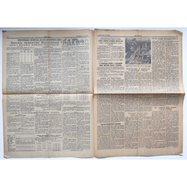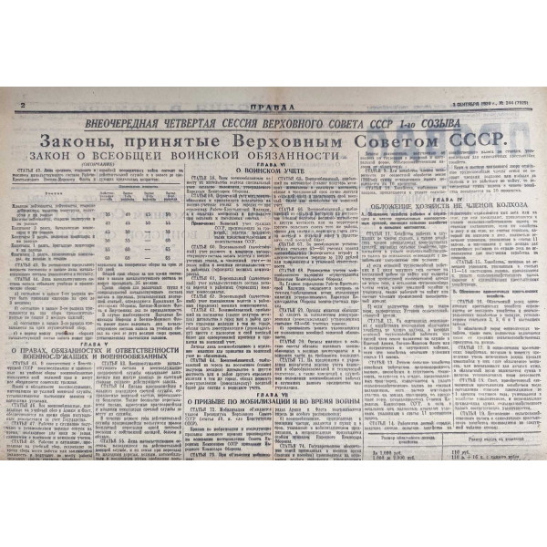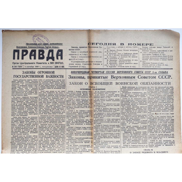The Supreme Soviet of the USSR adopted a law on universal conscription. Article 7: The terms of active service are established as follows: for the rank and file of the Red Army - 2 years, for junior commanding personnel - 3 years...