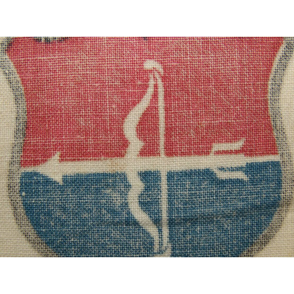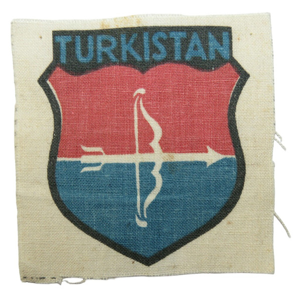 Turkistan volunteer sleeve shield worn by units composed of recruits from the Turkic peoples of Soviet Central Asia. This sleeve shield served as a national identification insignia rather than indicating a specific regiment or division. Printed construction on fabric base, featuring the inscription TURKISTAN and a bow-and-arrow symbol. Mint condition, no signs of use.