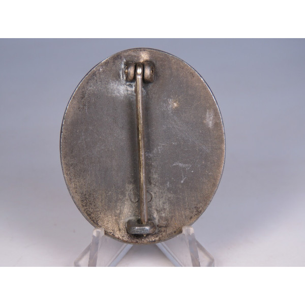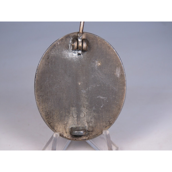 Verwundetenabzeichen 1939 badge, silver grade, PKZ 65, made of zinc. Manufacturer — PKZ 65, Klein & Quenzer, Idar-Oberstein. PKZ stands for Präsidialkanzlei (Reich awards department). Condition is average.