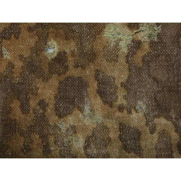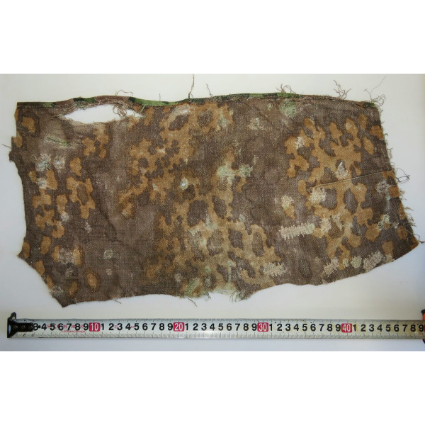 Original fragment of drill cloth used in the production of Waffen-SS field trousers and jackets. Features the Eichenlaubmuster ("Oak Leaf") camouflage pattern. The fabric shows heavy wear and period repairs. Extremely rare. A noteworthy example of a worn SS uniform piece with strong field character and authenticity.