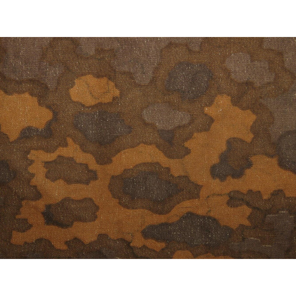Original Waffen-SS camouflage fabric fragment in the Eichenlaubmuster ("Oak Leaf") pattern from a late-war issue. Printed on coarse-weave cloth typical of the final production phase. The colors are vivid and the pattern is clearly defined. Unused condition with no damage or storage wear. A fine example of SS camouflage, suitable for both collection and historical textile analysis.
