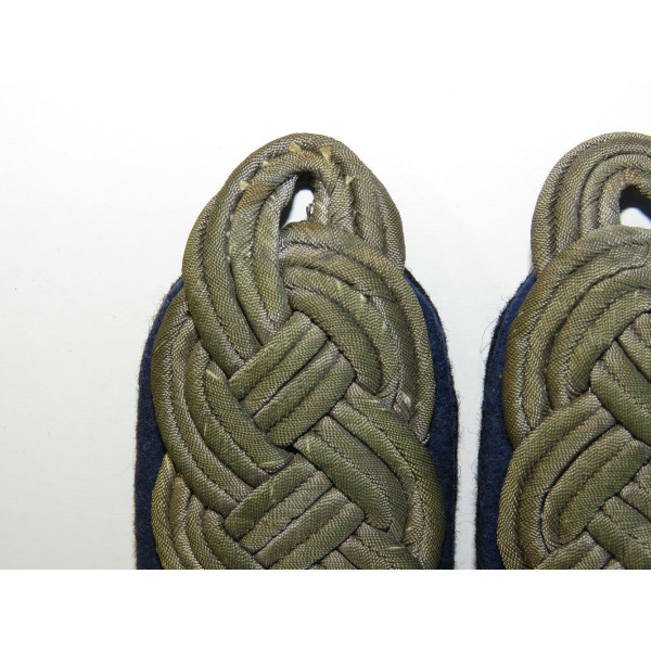 Pair of Waffen-SS shoulder boards in private purchase, extra-quality construction, corresponding to the rank of Sturmbannführer. Made of black felt with a blue felt underlay indicating medical service. Finished with dark, heavy metallic bullion braid of high quality. Fitted with a cipher featuring the Aesculap symbol, characteristic of Waffen-SS medical personnel.