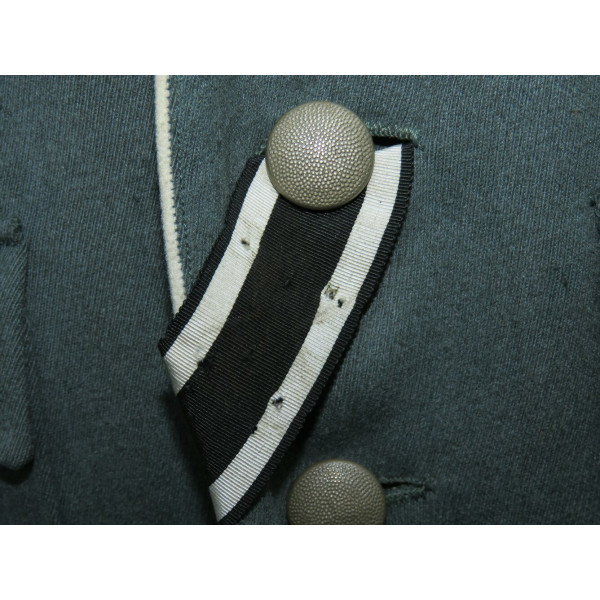 Early parade Waffenrock of a Wehrmacht infantry major with full white piping along the front, cuffs and dark-green collar. Early nickel-silver buttons throughout. The right sleeve shows traces of a removed Ehrenband. The adjutant’s aiguillette is placed in the shoulder loop. Officer shoulder boards and collar tabs display white infantry piping. The ribbon bar includes: Medaille zur Erinnerung an den 1. Oktober 1938, Winterschlacht im Osten 1941/42, Kriegsverdienstkreuz 2. Klasse mit Schwertern and Eisernes Kreuz 2. Klasse 1939. The buttonhole carries the black ribbon of the Eisernes Kreuz 1914.