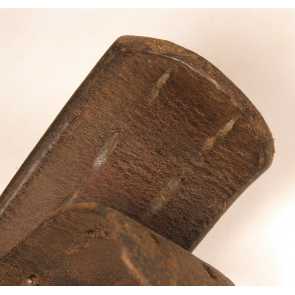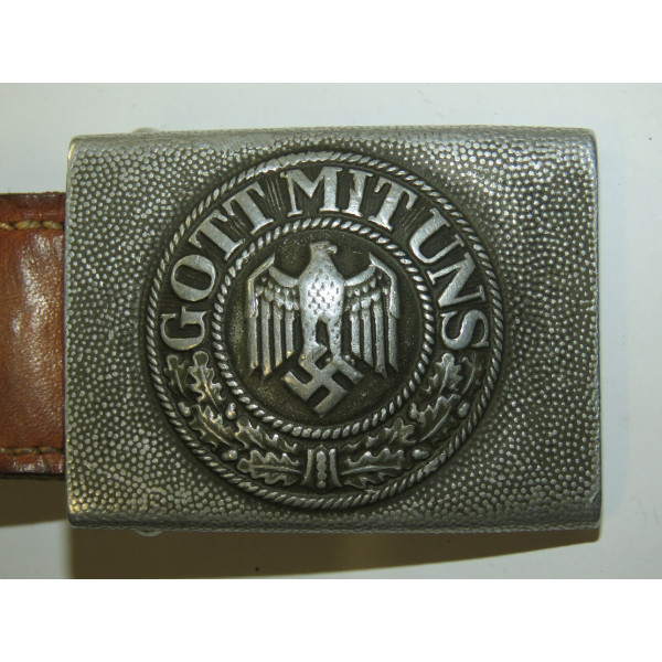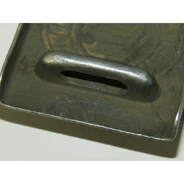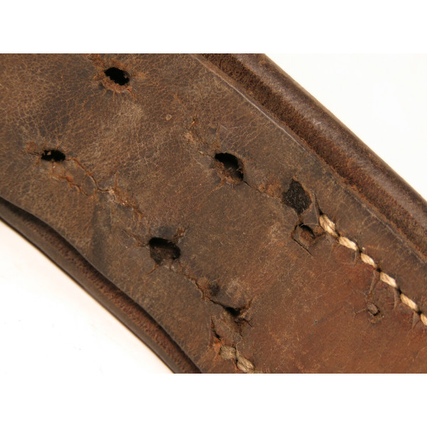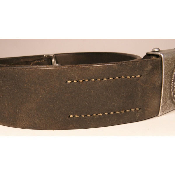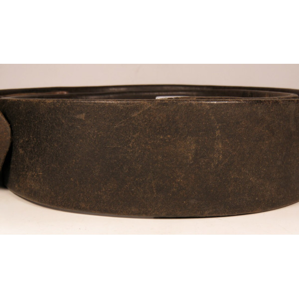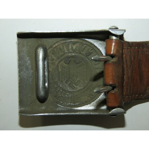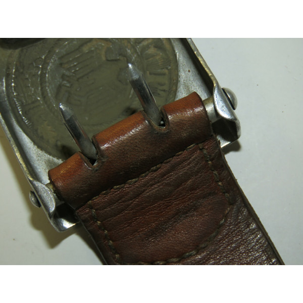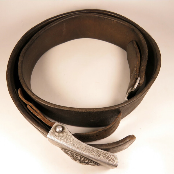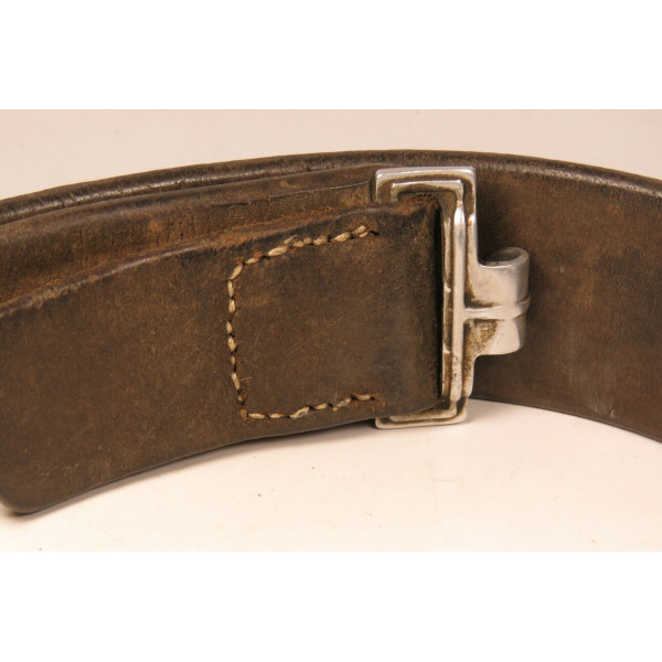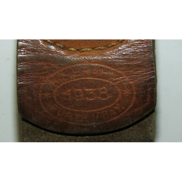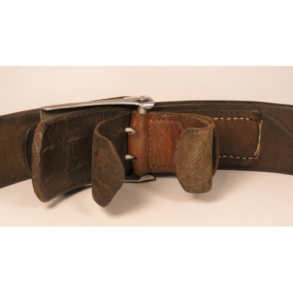 Wehrmacht combat belt with an aluminum buckle, the leather tab marked K.E. Brahm, Fürth – 1938. The belt strap is unmarked, with an aluminum catch, cut down to 95 centimeters. The maker of this buckle is exceptionally scarce, and examples of this type are rarely encountered, which significantly increases its appeal for collectors.