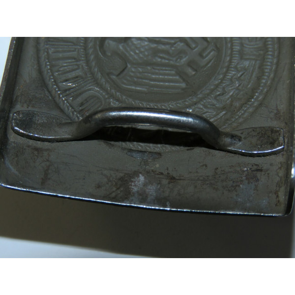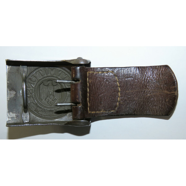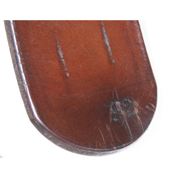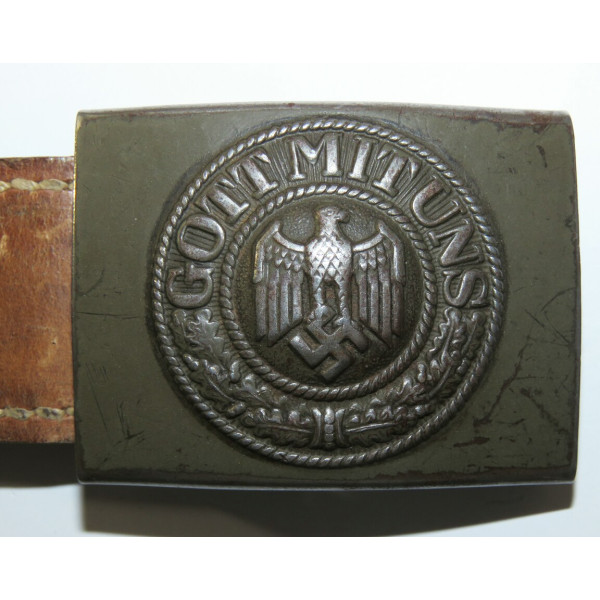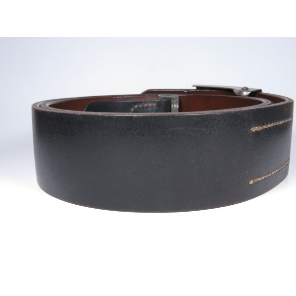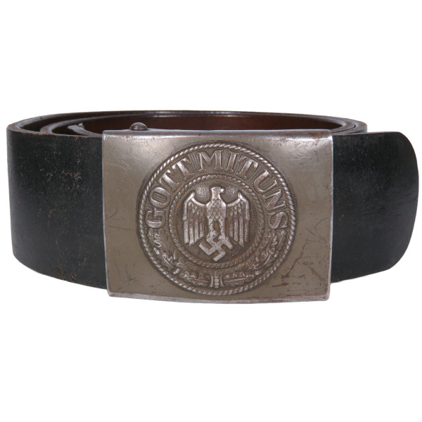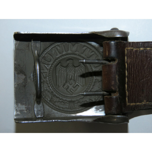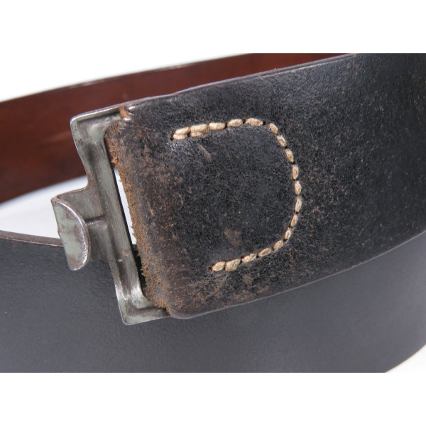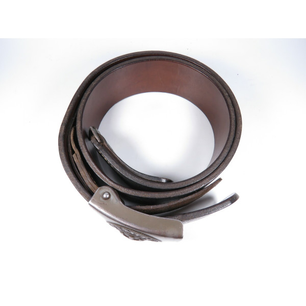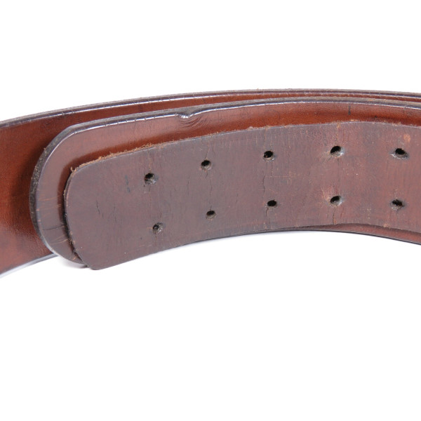 A field leather belt with a steel buckle, complete example in superb deep brown color and exceptional condition. Rare size 92, with a 1941 circular marking near the catch identifying Gustav Büdishkowski, Bielefeld. The buckle is by the scarce maker B. Harmann, 1941, Lüdenscheid, with leather tab. One of the best-preserved belts, without significant combat wear, fully meeting high-grade collection standards.