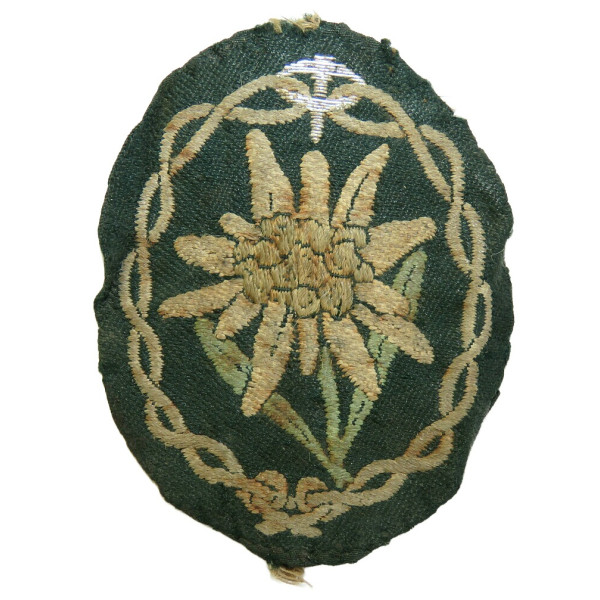 Gebirgsjäger sleeve patch manufactured in BEVO jacquard weave. Features the edelweiss emblem, symbol of mountain units, woven on dark cloth. Removed from a tunic, with stitch marks and signs of field wear along the edges.