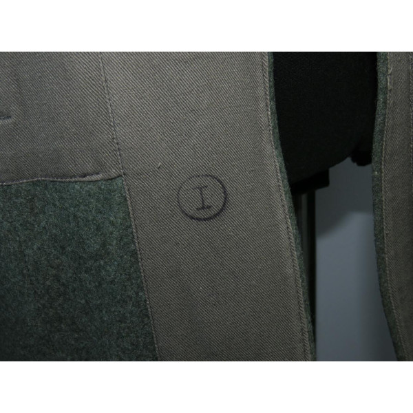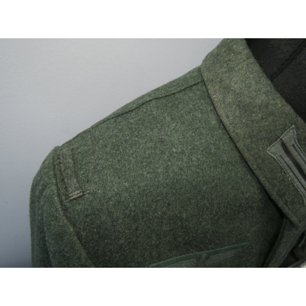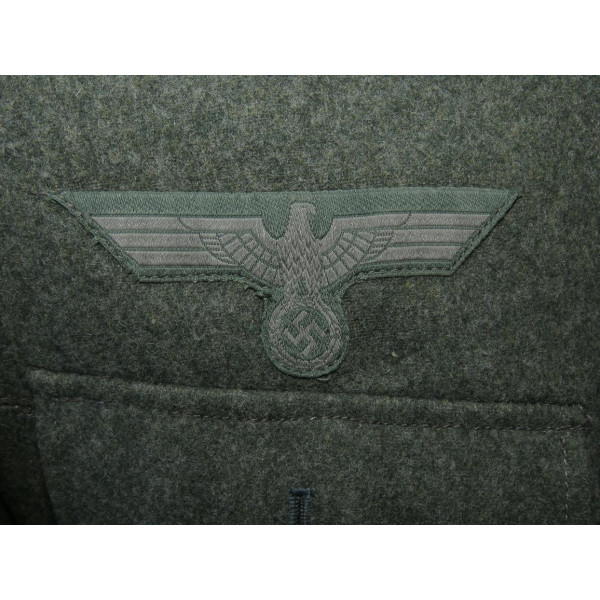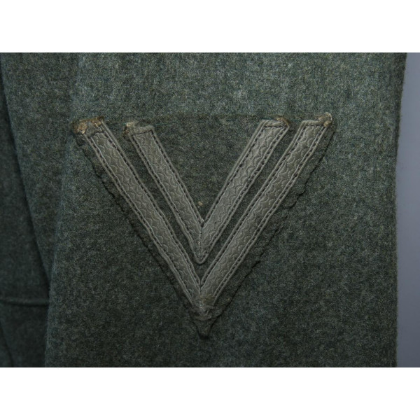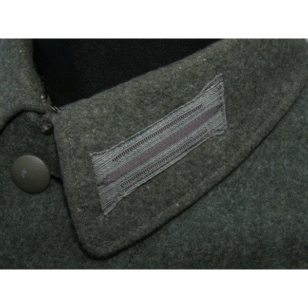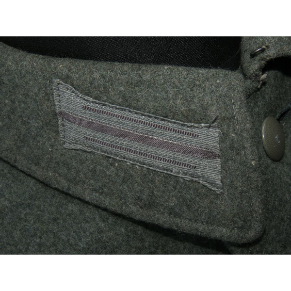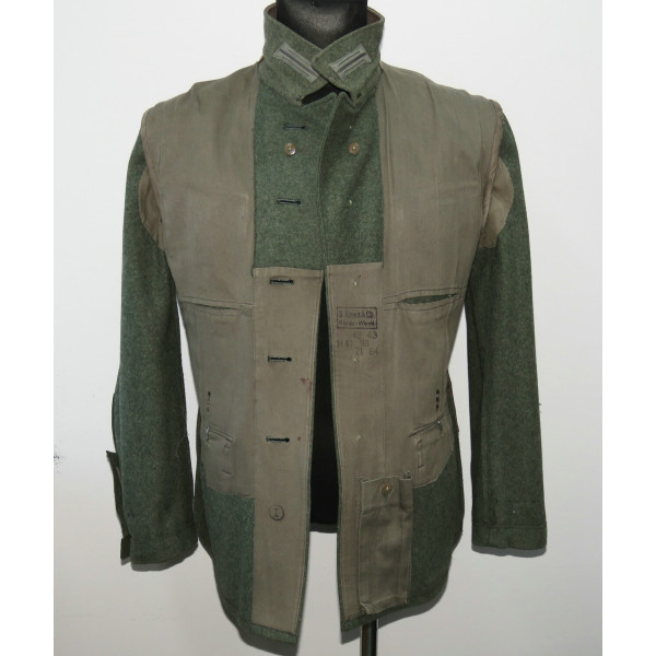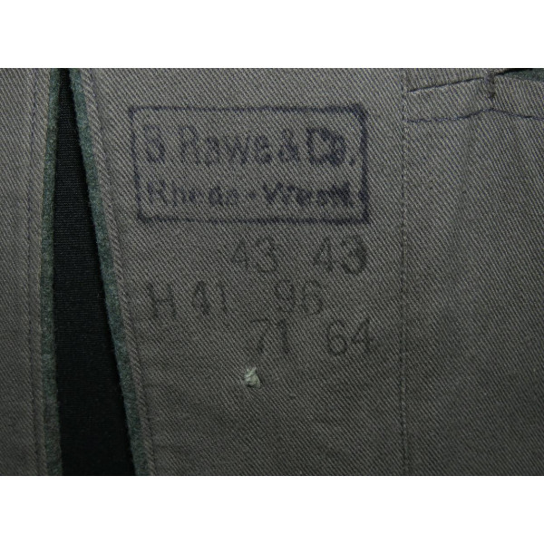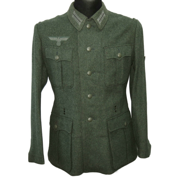 Wehrmacht (Heer) M40 pattern field tunic. The tunic is preserved in excellent overall condition, showing only minimal signs of wear. There is internal staining: a red-colored substance was previously placed inside the right pocket, most likely primer; no traces are visible on the exterior. The breast eagle is originally sewn, as are the collar tabs. The Obergefreiter sleeve chevron is attached with coarse period stitching. Shoulder strap buttons are missing; the fabric condition suggests they were never installed. Shoulder strap buttons can be supplied if required. Manufacturer marked B. Rave und Co., Reda, Westphalia. A government military depot stamp from Hannover dated 1941 is present. Measurements: collar circumference 43 cm, collar-to-waist length 43 cm, chest circumference 96 cm, total length 71 cm, sleeve length 64 cm. Size 50 (M)