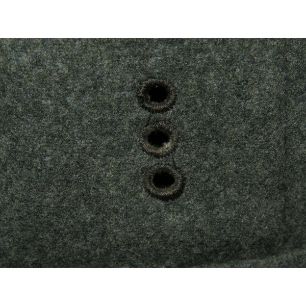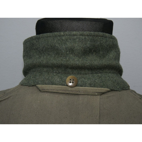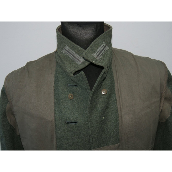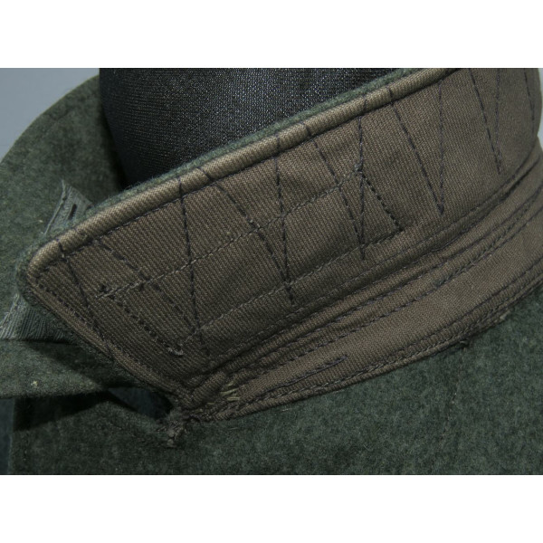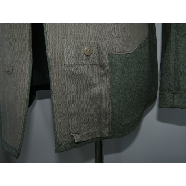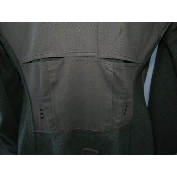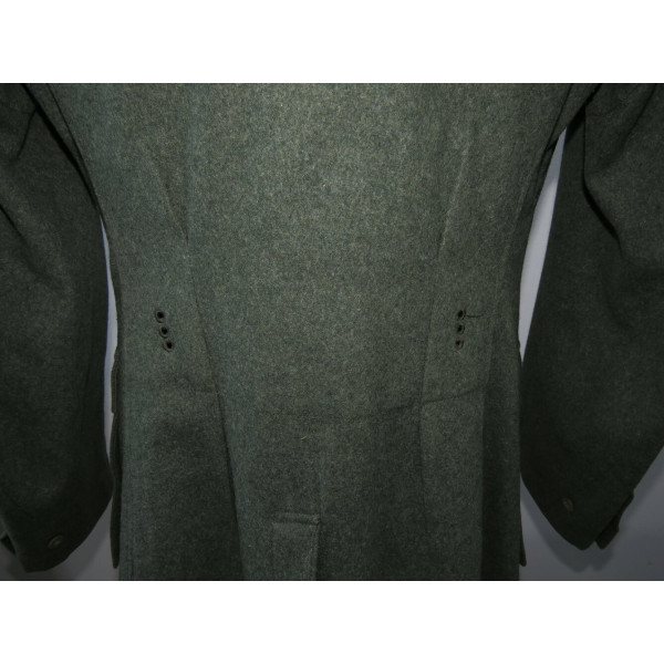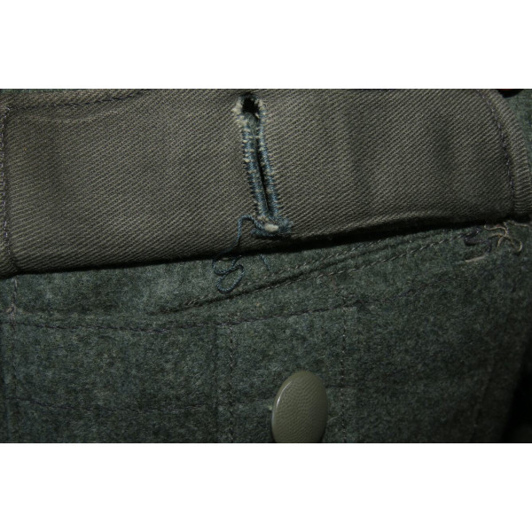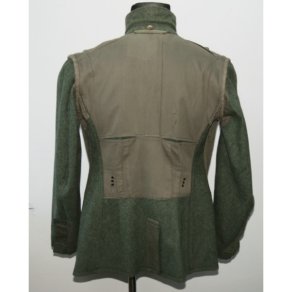 Wehrmacht (Heer) M40 pattern field tunic. The tunic is preserved in excellent overall condition, showing only minimal signs of wear. There is internal staining: a red-colored substance was previously placed inside the right pocket, most likely primer; no traces are visible on the exterior. The breast eagle is originally sewn, as are the collar tabs. The Obergefreiter sleeve chevron is attached with coarse period stitching. Shoulder strap buttons are missing; the fabric condition suggests they were never installed. Shoulder strap buttons can be supplied if required. Manufacturer marked B. Rave und Co., Reda, Westphalia. A government military depot stamp from Hannover dated 1941 is present. Measurements: collar circumference 43 cm, collar-to-waist length 43 cm, chest circumference 96 cm, total length 71 cm, sleeve length 64 cm. Size 50 (M)