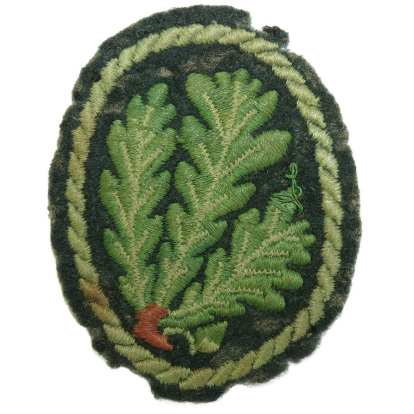 Sleeve patch for Wehrmacht Jäger units, officially introduced by OKH order on 2 October 1942 (HM 42 No. 892). Made of felt with machine-embroidered design featuring three oak leaves — emblem of light infantry. Intended to be worn on the right sleeve of the tunic, approximately 16 cm below the shoulder seam. This example shows heavy signs of field use. Salty