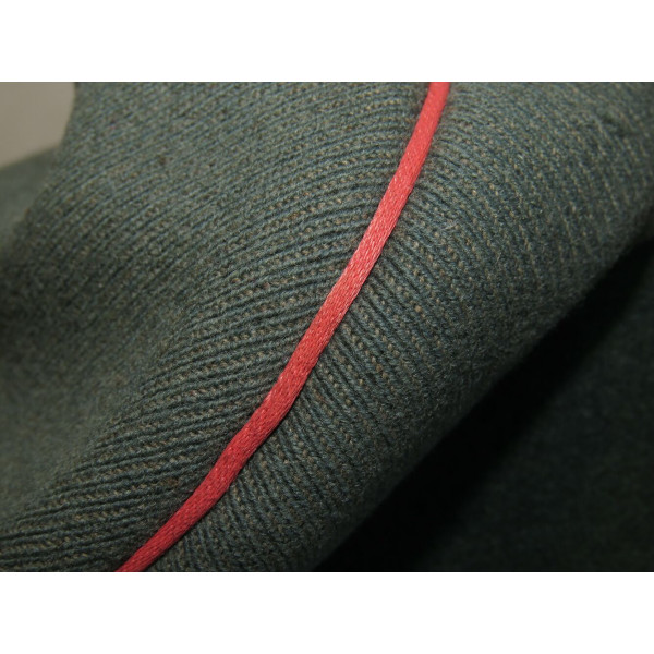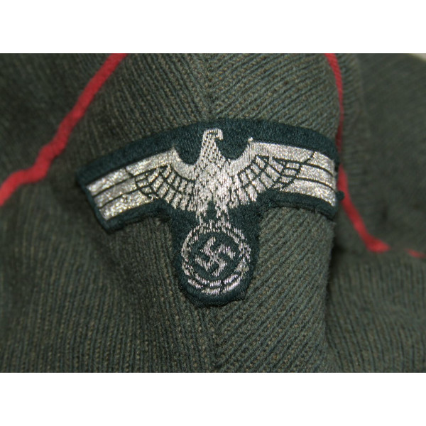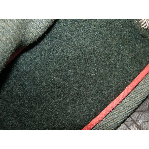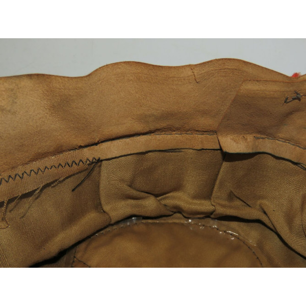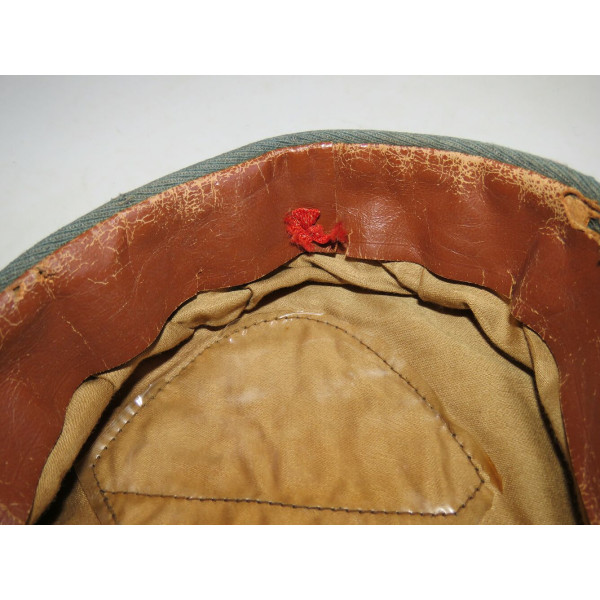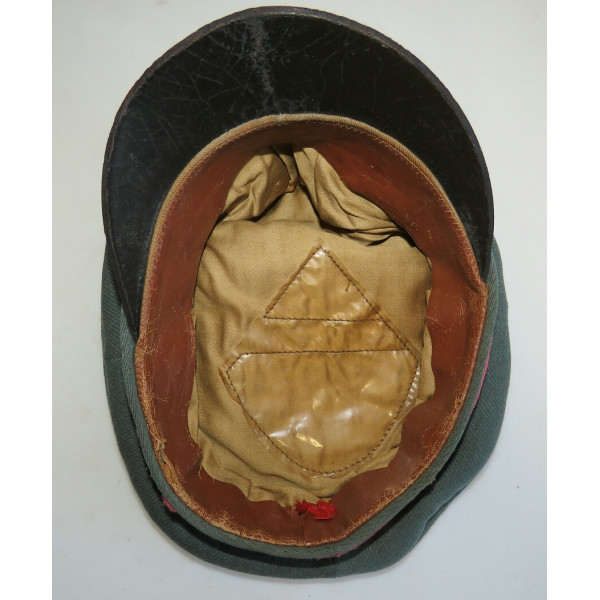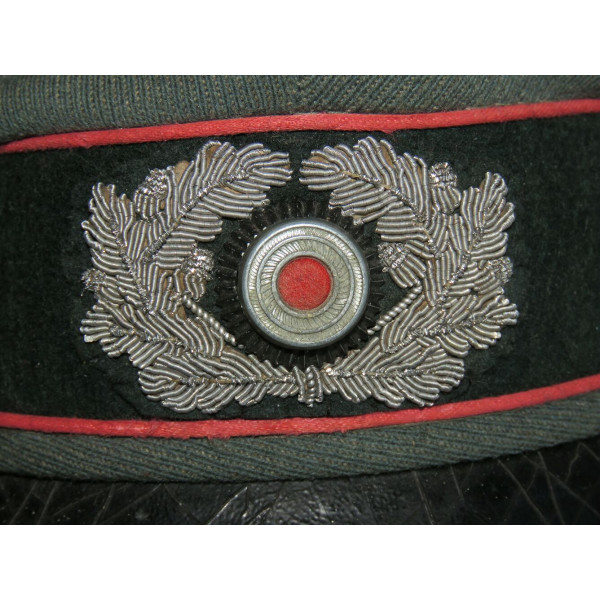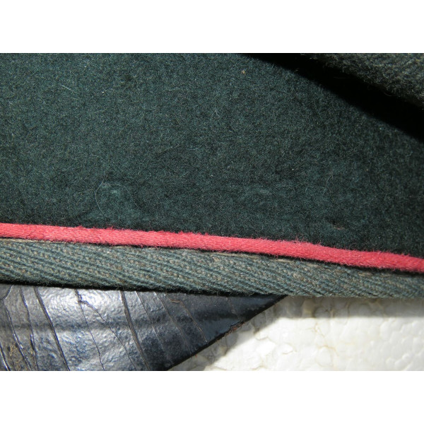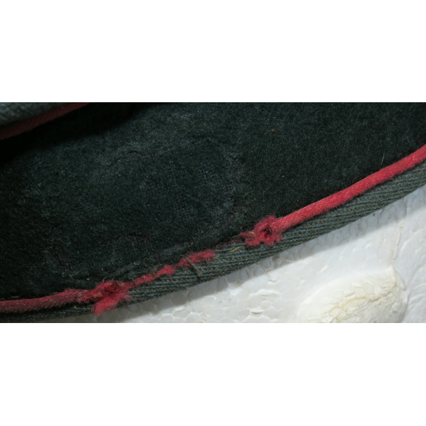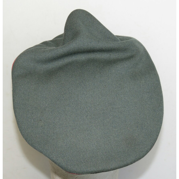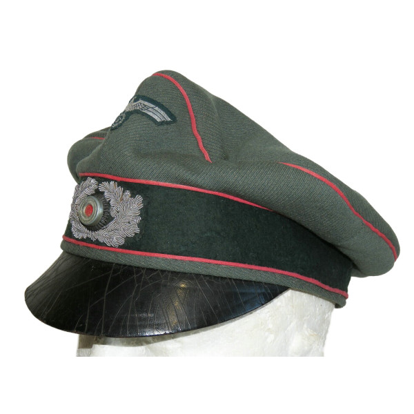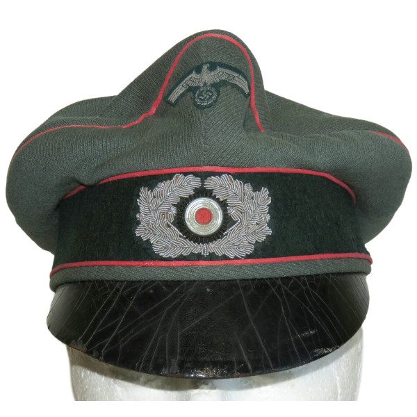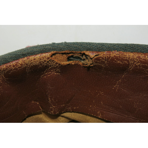 Wehrmacht Panzer field cap of the so-called crusher type. An interesting example constructed with shoulder-board piping applied around the band and crown. Features a leather lacquered visor and is made from diagonal wool of high officer quality. Shows signs of use, with a well-executed repair to the band on the right side. Otherwise a fine and rarely encountered example.
