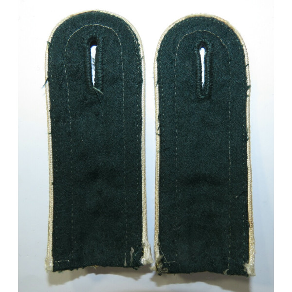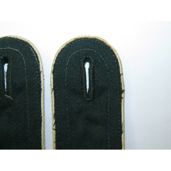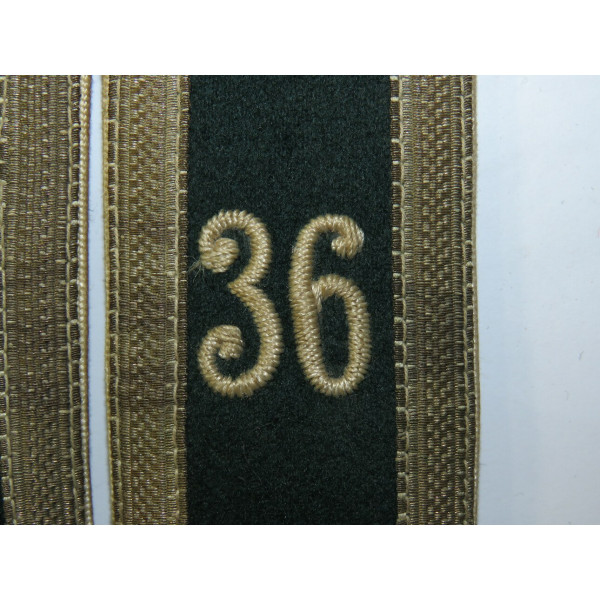 Early shoulder boards for an infantry NCO Waffenrock of the 36th Regiment, made of dark green cloth with white piping, sewn-on type with silk-embroidered numerals 36. In good condition with signs of wear.