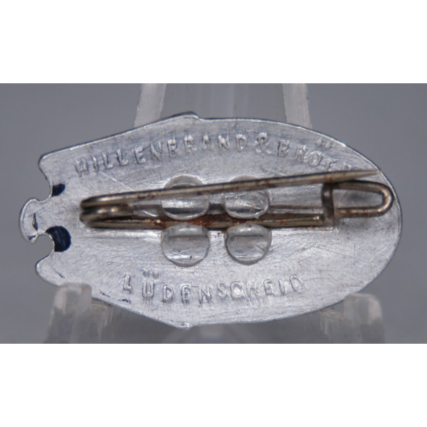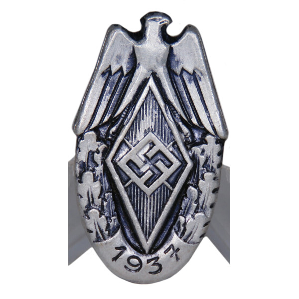 The Hitlerjugend competition badge of 1937 is oval-shaped with an eagle above the Hitlerjugend diamond and swastika in the center, the date 1937 at the bottom. Produced in aluminum and maker marked Willembrand und Broek, Lüdenscheid on the reverse. Excellent condition.